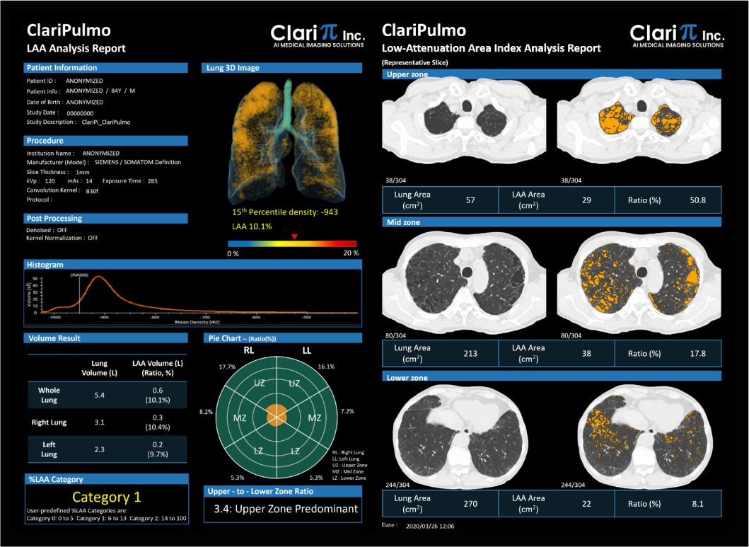 - ClariPulmo provides summary reports for measurement results that contain color overlay images for lung tissues as well as table and charts displaying analysis results
